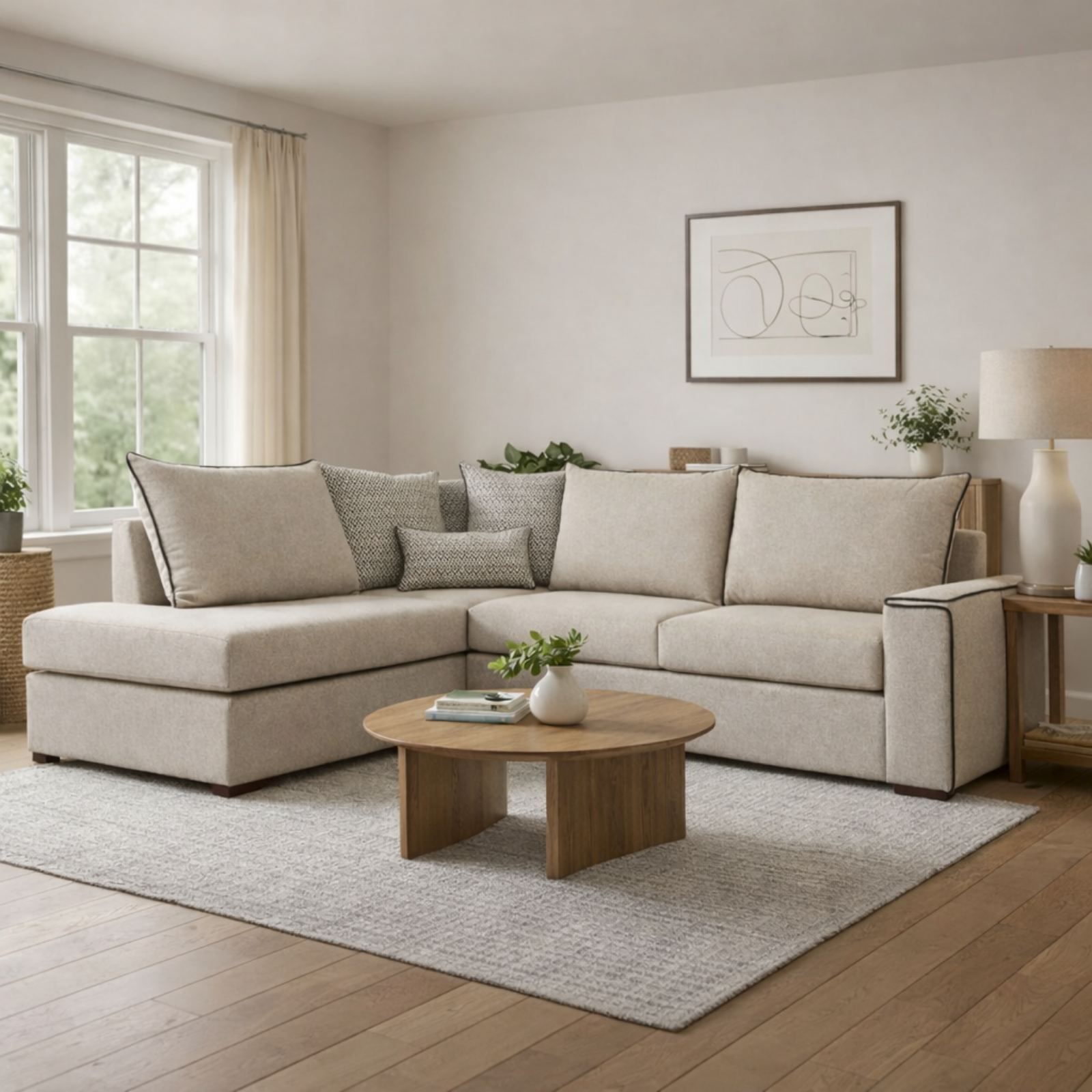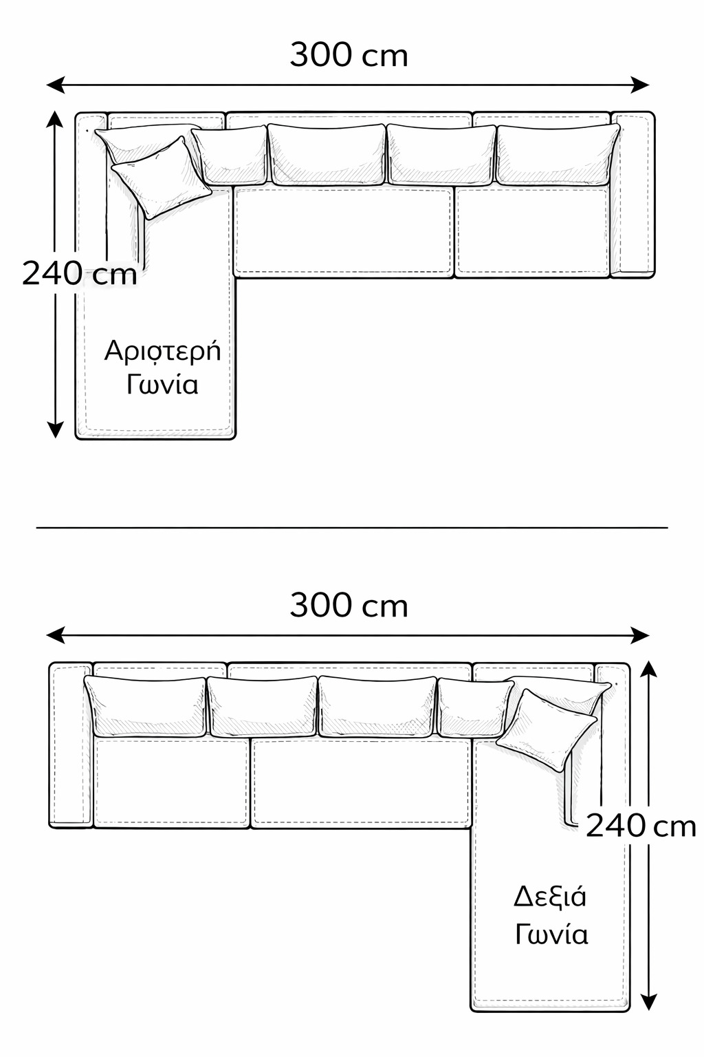 Ο Velar προσφέρεται με δυνατότητα δεξιάς ή αριστερής γωνίας, ώστε να προσαρμόζεται απόλυτα στη διάταξη και στις ανάγκες κάθε χώρου. Οι βασικές του διαστάσεις είναι 300 × 240 cm, ενώ παρέχεται και δυνατότητα κατασκευής σε ειδικές διαστάσεις, ώστε να ταιριάζει ιδανικά στον χώρο σας.