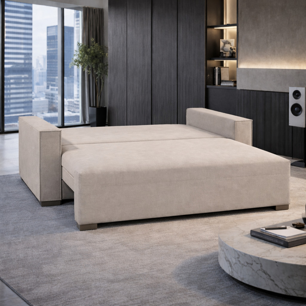 Ο MODŌ μετατρέπεται σε κρεβάτι με συρταρωτή ανάπτυξη, χωρίς μεταλλικούς μηχανισμούς. Η κατασκευή αυτή προσφέρει αυξημένη αξιοπιστία και αντοχή στον χρόνο, καθώς αποφεύγονται κινούμενα εξαρτήματα που υπόκεινται σε φθορά. Η επιφάνεια ύπνου είναι σταθερή και επίπεδη, κατάλληλη τόσο για φιλοξενία όσο και για συχνή χρήση.